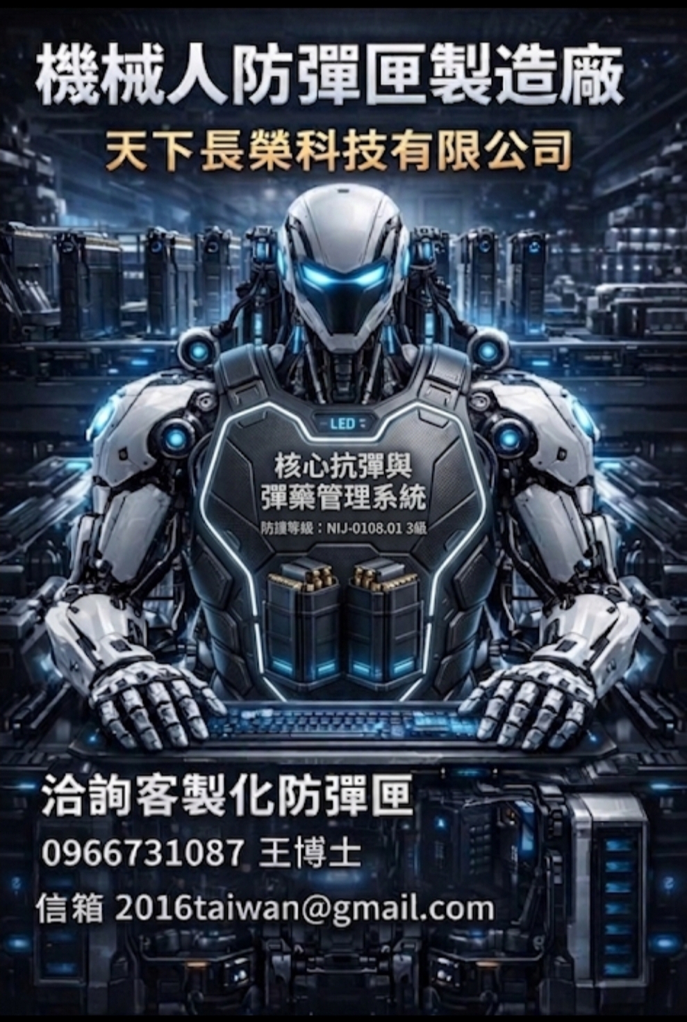 天下長榮科技有限公司製造AI機械人專用,輕量化防彈匣艙。保護AI電腦主機,防彈匣艙。歡迎機械人開發單位合作應用。連絡人王博士,電話